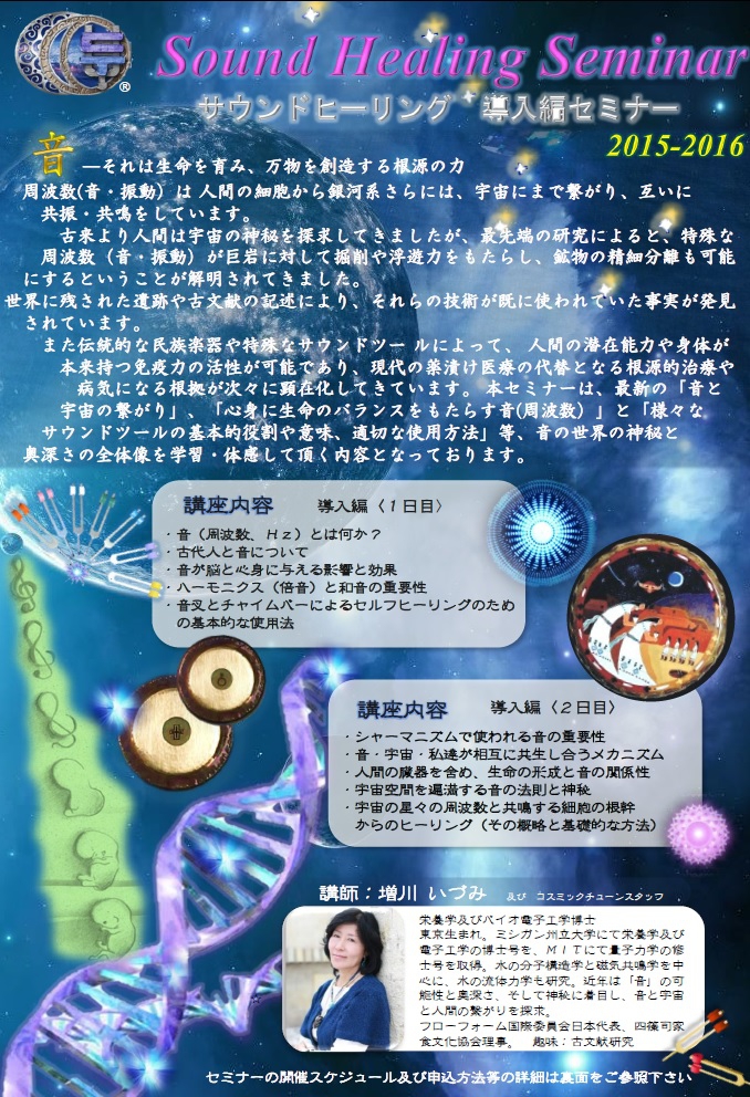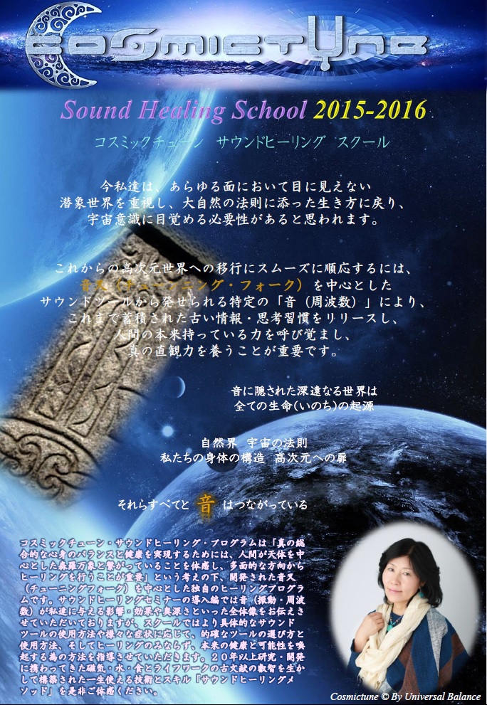 多くの方々からご期待を頂いておりました、【サウンドヒーリング〈導入編セミナー〉】と、次のステップとなる【コスミックチューンサウンドヒーリングスクール】の新しい日程を設けさせていただきましたので、お知らせ致します。